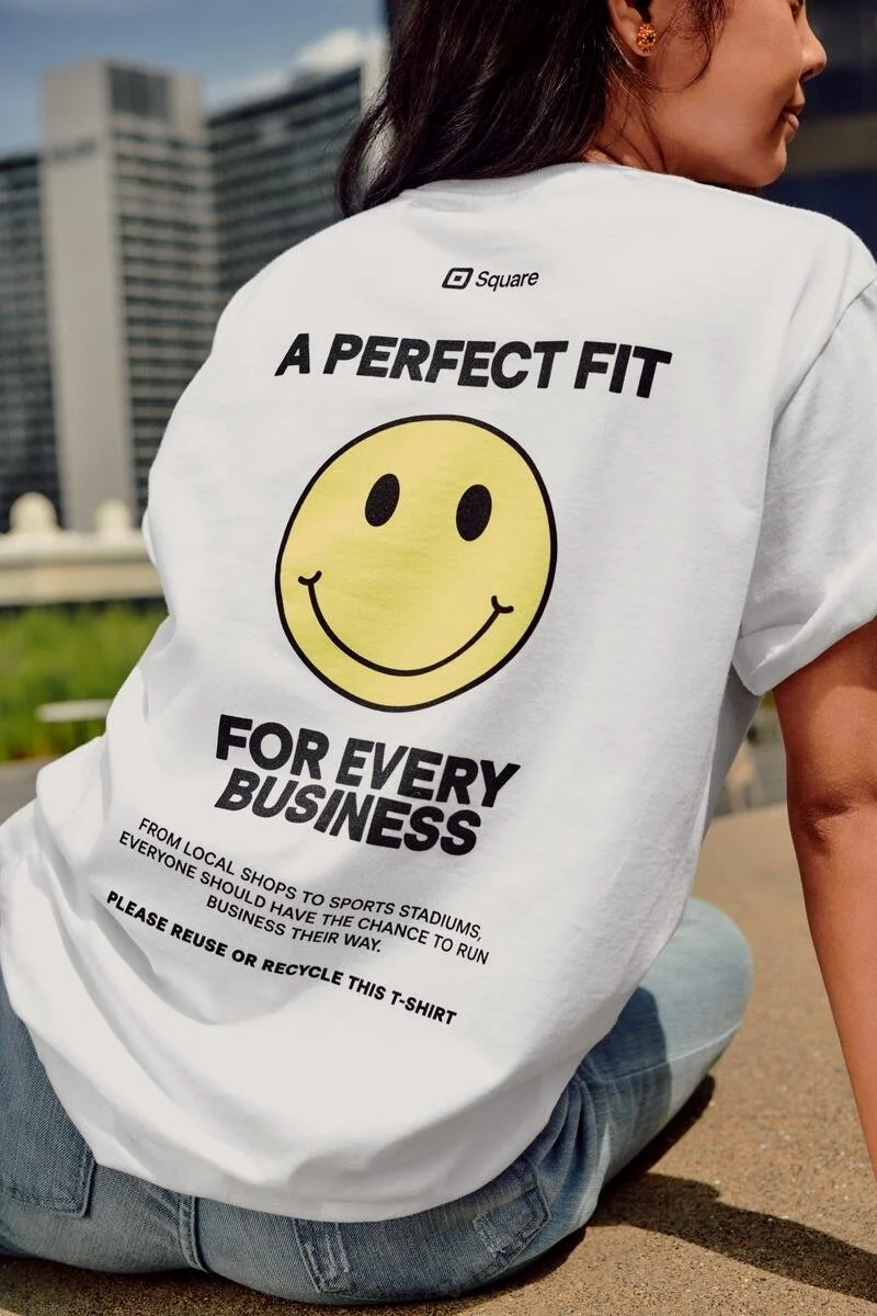 Our Brand team had the opportunity to design new Square swag and accessories. The goal was to create items that would speak to the realities of running a business. We hoped the swag would resonate with business owners and fans of the brand as equally as Square employees. It was a lot of fun to write irreverent, playful copy across shirts, hats, and more. One of the statement pieces, the Smiley Face tee, pays homage to takeout bags that so many restaurants are known for.